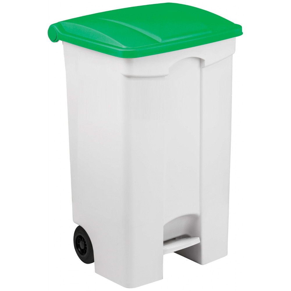 Die Deckel in verschiedenen Farben, darunter Grün, erleichtern die Mülltrennung und ermöglichen ein effizientes Recycling sowie einen erhöhten Umweltschutz.