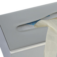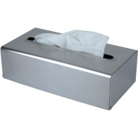 Taschentuchspender aus glänzendem oder gebürstetem Edelstahl. Kunststoffschutz unter der Box. Mit Wandbefestigung oder zum Aufstellen. Für Boxen von 25 x 13 x Höhe 7 cm.