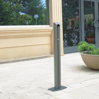 - Materialien: Säule aus Corten-Aluminium, Drückplatte aus Edelstahl, Behälter aus verzinktem Stahl.