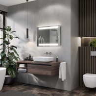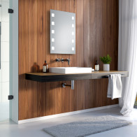 Konfigurieren Sie Ihren Spiegel mit den verfügbaren Abmessungen von 40 x 40 cm bis 180 x 180 cm. Sie können auch eine Uhr und einen runden Vergrößerungsspiegel sowie eine Rasiersteckdose hinzufügen.