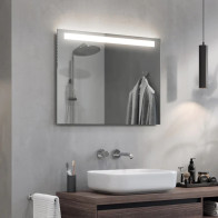 Dieser rechteckige Spiegel ist mit einem horizontalen LED-Streifen im oberen Teil des Spiegels ausgestattet. Das Aussehen dieses Spiegels bringt Schlichtheit und Beruhigung in Ihren Wohnraum. Er eignet sich für alle modernen Badezimmer.