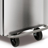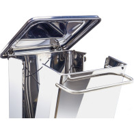 HACCP-verkleideter Tretabfallbehälter 110 Liter aus weiß lackiertem Stahl. Deckelöffnung von oben, betätigt durch Tritt, Beutelentleerung von der Vorderseite des Mülleimers. Ideal für Restaurant- und Gemeinschaftsküchen. Hygienisch und leicht zu reinigen.