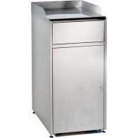 HACCP-verkleideter Pedalbehälter 70 Liter aus glänzendem Edelstahl. Deckelöffnung von oben durch Pedalbetätigung, Entleerung des Beutels von der Vorderseite des Mülleimers. Ideal für Restaurant- und Gemeinschaftsküchen. Hygienisch und leicht zu reinigen.