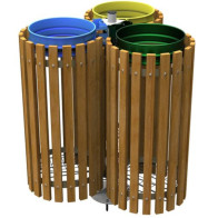 Double crown recycling bin for selective sorting in rural areas. Fixing the post of the bin bag holder in concrete. Double bin equipped with two anti-degradation and anti-animal surrounds made of recycled plastic with a wood appearance. Bin bags are easily placed and removed from the front of each surround thanks to the opening of the surround. Possibility to add coloured lids and posters (optional).
