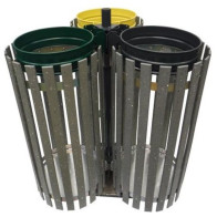 Triple crown recycling bin for selective sorting in rural or urban areas. Fixing of the bin bag holder post directly into the concrete. Triple bin equipped with three anti-degradation and anti-animal surrounds made of recycled plastic with a wood appearance. Bin bags are easily placed and removed from the front of each surround thanks to the opening of the surround. Possibility to add coloured lids and posters (optional).
