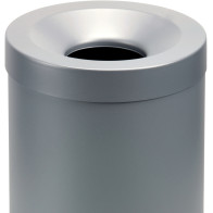 This 50-litre fire-resistant bin, with its black epoxy powder-coated steel body and blue lid, is designed to limit the size of waste deposited thanks to its 14 cm opening. This prevents the introduction of large waste, ensuring optimal use for offices and reception areas. The raised lid and fire-resistant head prevent combustion and the spread of flames, while the rubber base ensures stability. CNPP certification.