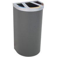Recycling bin for indoor and outdoor communal spaces. 3 waste sorting streams. Bin bag support rings included for each sorting area. Identification of each waste type with a logo.